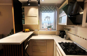 2. Otwarta kuchnia z oknem - w pełni wyposażona: zmywarka w zabudowie, lodówka, piekarnik w zabudowie oraz płyta gazowa. Atutem jest także okno w kuchni.