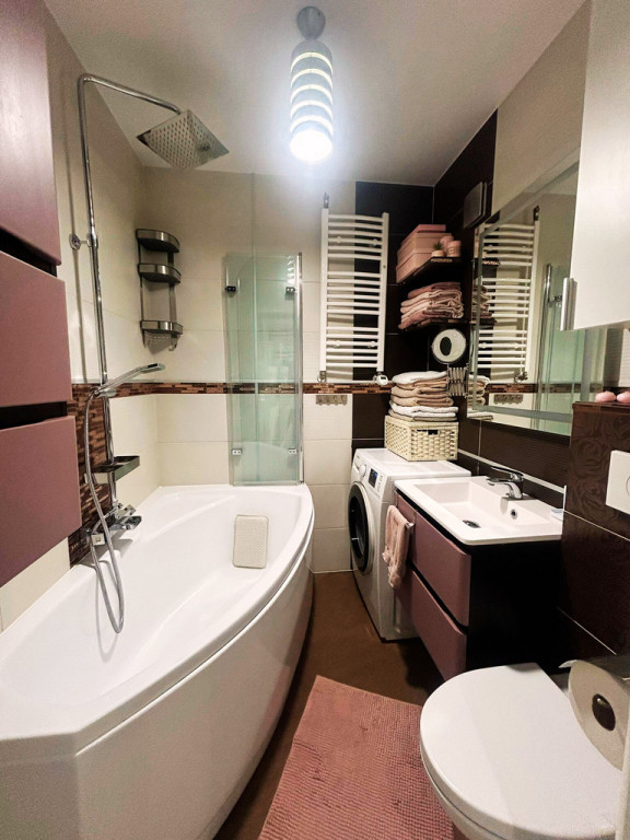 4. Łazienka z WC – przestronna, z narożną wanną, szybą prysznicową, deszczownicą i ogrzewaniem podłogowym