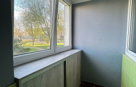 6. Zabudowany balkon typu loggia, wyposażony w praktyczne szafki, które świetnie sprawdzą się jako dodatkowe miejsce do przechowywania, np. przetworów czy innych zapasów.