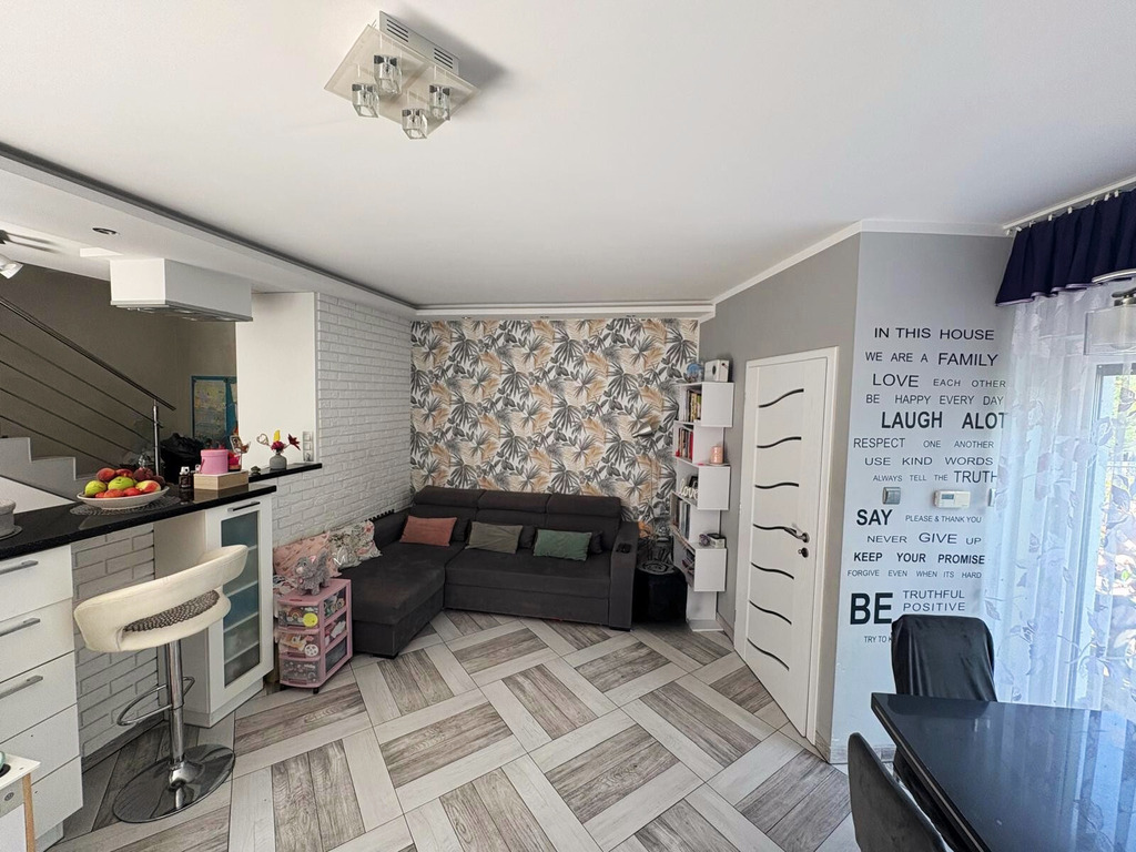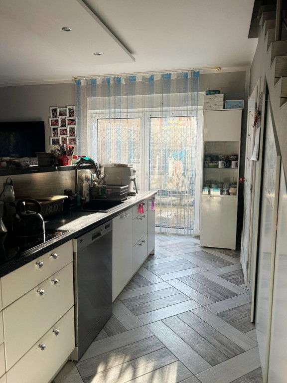 2. Salon z aneksem kuchennym – serce domu z bezpośrednim wyjściem na taras i do ogródka. Funkcjonalna kuchnia wyposażona w zabudowaną pralkę oraz zmywarkę pod blatem, uzupełniona o praktyczne, wkomponowane szafki pod schodami, zapewniające dodatkową przestrzeń do przechowywania.