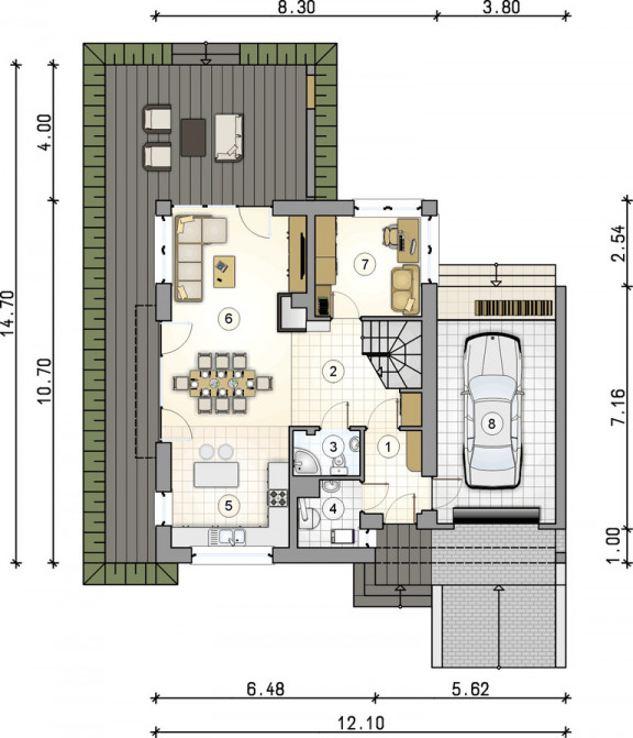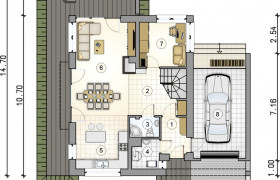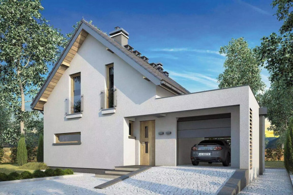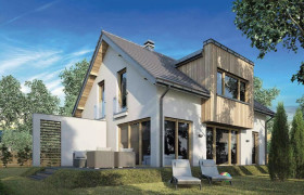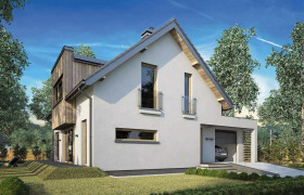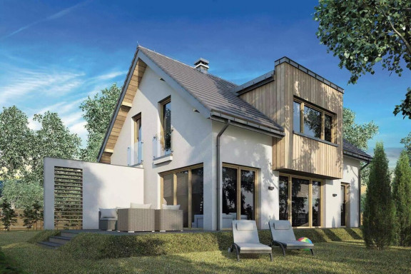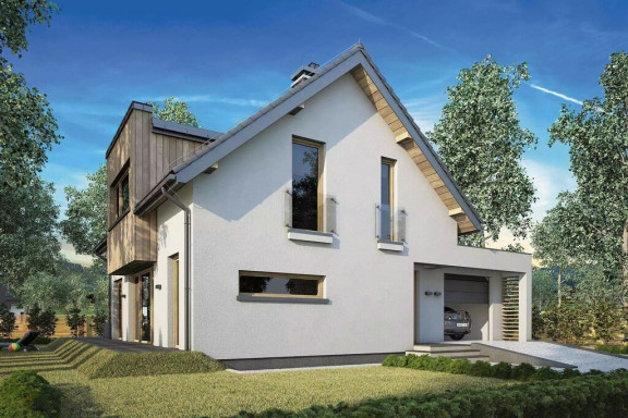 Nowoczesny i energooszczędny wolnostojący dom z poddaszem użytkowym, przestronnym tarasem oraz garażem w bryle budynku, z oryginalnym ryzalitem frontowym o łącznej powierzchni użytkowej 107,45 m², na którą składają się: